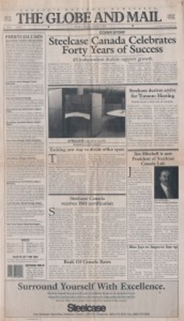 The actual newspaper inside the dodger was the regular day’s edition of the Globe & Mail. Importantly, there was also a full-page ad for Steelcase included inside that run of press national edition.
