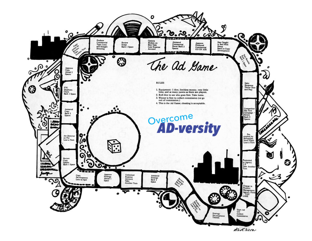 To get copy on the drawing, we had to engage Werner in our typesetting department to generate each little caption. Bob then pasted each one on his inked drawing. Once we were done assembling it, he took the finished game to the photostat department in the basement of the agency for them to make a high-resolution copy of the game.